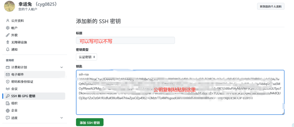 ssh公钥,标题随意,公钥就是之前文档的公钥id_rsa.pub按确定