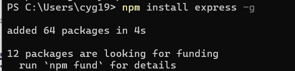 1 | npm install express -g//(管理员命令)出现以下说明成功 |