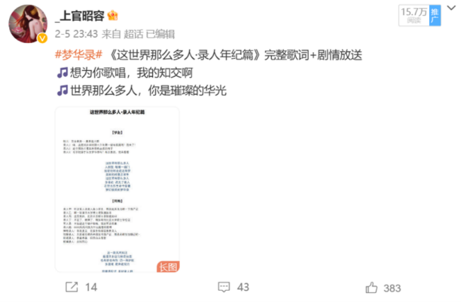 对了,去年我主持了录人中秋花月宴,今年录人元宵花月宴我填词了写给录人的歌,好像被录子的编剧听见看见啦,这样是不是离你更近了点?