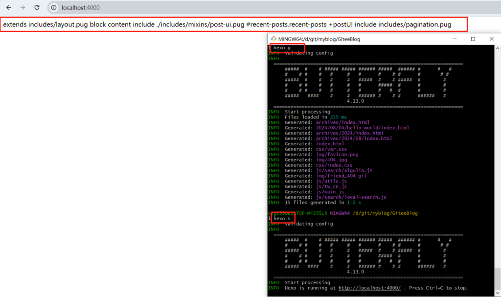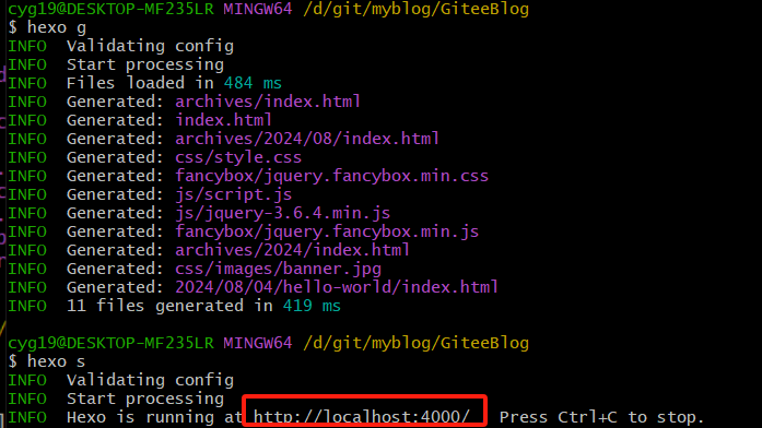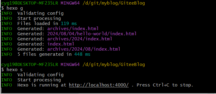hexo g:这个命令是用于生成(Generate)静态文件的。对 Hexo 网站的内容进行更改后,运行这个命令来重新生成静态文件,以便这些更改能够反映出来。生成的静态文件会存放在 Hexo 项目的public目录中。(hexo g类似于c++里的编译)hexo s:这个命令是用于启动(Server)一个本地开发服务器的。本地预览 Hexo 网站。运行这个命令后,Hexo 会提供一个本地 URL,可以通过浏览器访问这个地址查看网站。(hexo s类似于c++里的运行)