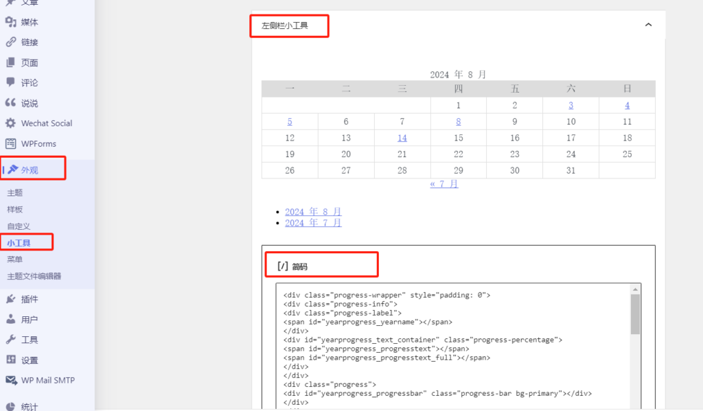 - 外观 —— 小工具 —— 站点额外内容 —— 旧版小工具 —— 统计