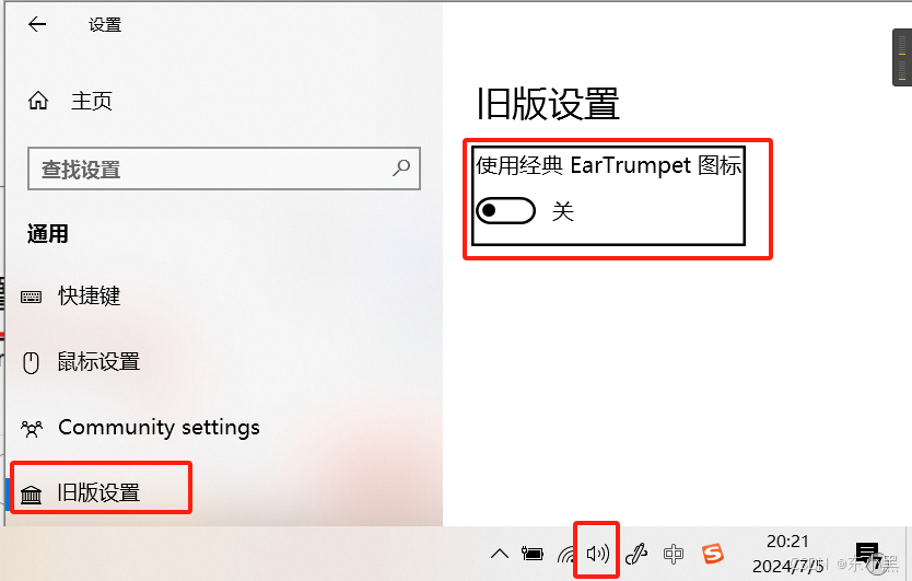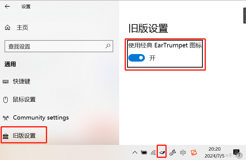 左键单击`旧版设置`,使`使用经典 EarTrumpet 图标`状态为`关`