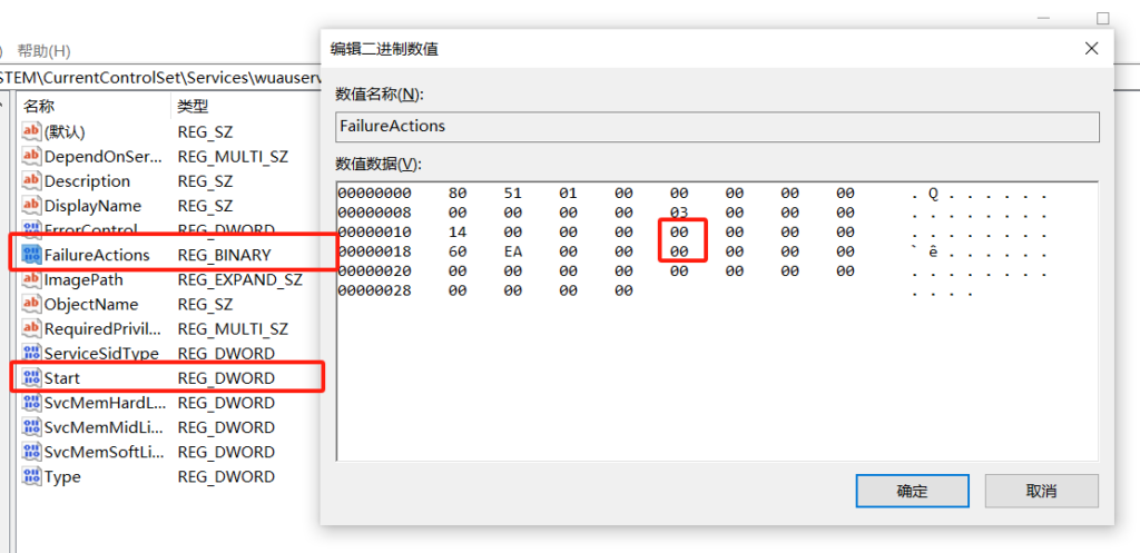 找到 ”FailureActions“,双击编辑二进制数值如图所示