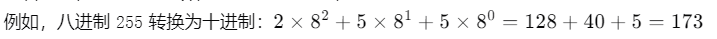 例如,十进制 173 转换为八进制:173/8=21…5173/8=21…5, 21/8=2…521/8=2…5, 2/8=0…22/8=0…2,逆序排列余数得到 255。