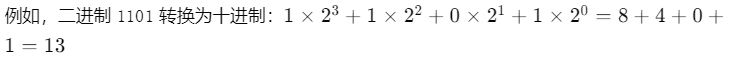从右到左,每位二进制数乘以2的相应权重(从0开始递增),然后将结果相加。