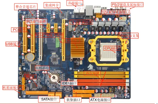 电脑中的其他配件,比如内存、CPU等都需要插到主板的特定的插槽中才能使用。硬盘、电源等设备需要通过数据线跟主板上的各类接口连接。电源通过连线插到主板上之后,由主板就可以向电脑各个配件供电。