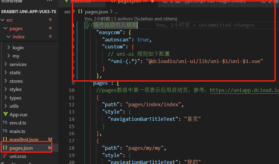 打开项目根目录下的 pages.json 并添加 easycom 节点: