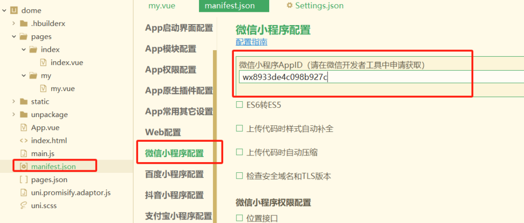 在 manifest.json 中添加微信小程序的自己的 appid 不是第一个,找到 小程序特有相关