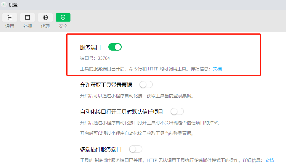 开启服务端口,微信开发者工具中开启