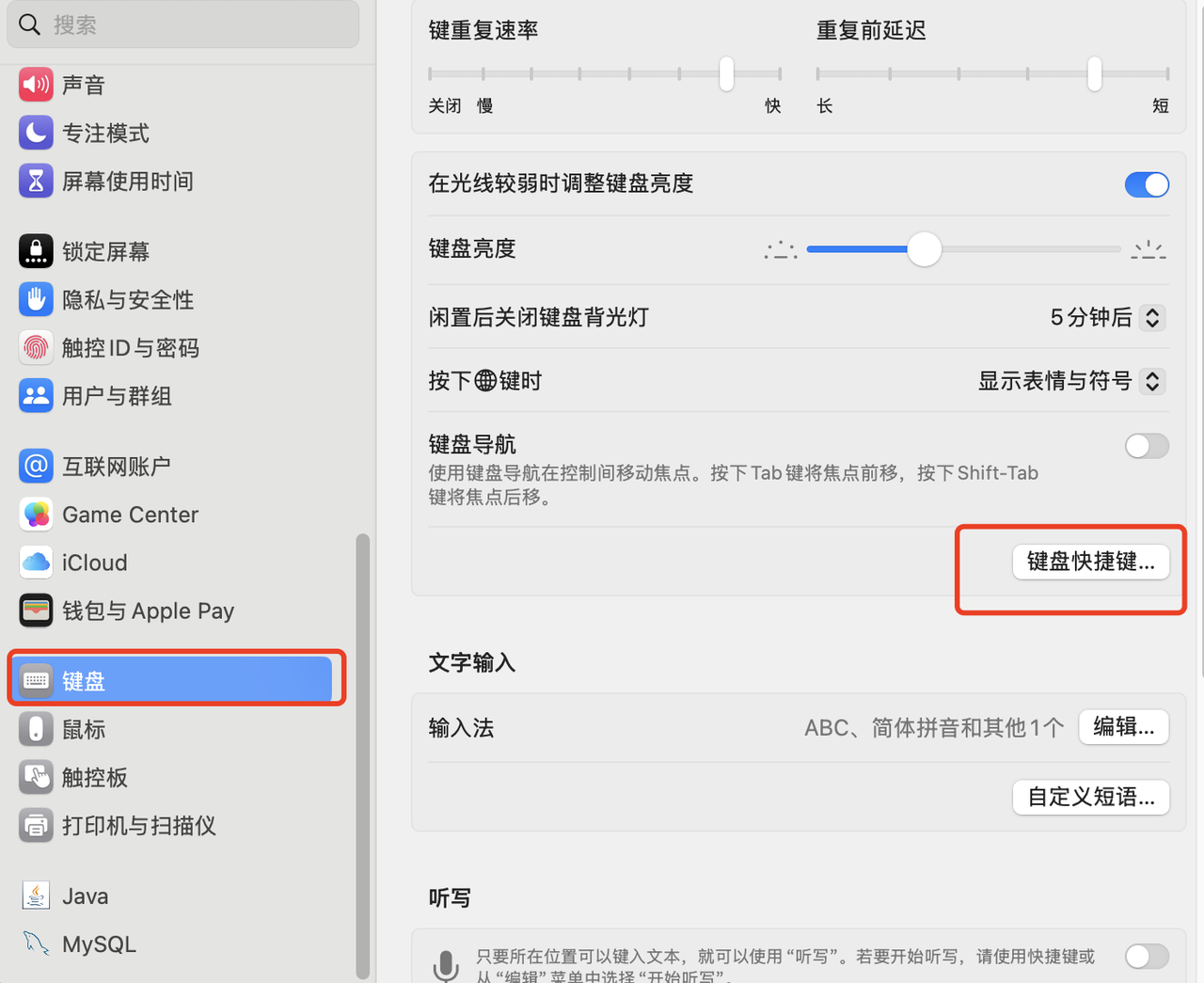 设置——键盘——键盘快捷键
