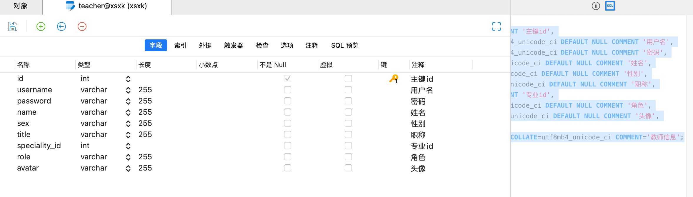 | CREATE TABLE `teacher` ( `id` int NOT NULL AUTO_INCREMENT COMMENT '主键id', `username` varchar(255) COLLATE utf8mb4_unicode_ci DEFAULT NULL COMMENT '用户名', `password` varchar(255) COLLATE utf8mb4_unicode_ci DEFAULT NULL COMMENT '密码', `name` varchar(255) COLLATE utf8mb4_unicode_ci DEFAULT NULL COMMENT '姓名', `sex` varchar(255) COLLATE utf8mb4_unicode_ci DEFAULT NULL COMMENT '性别', `title` varchar(255) COLLATE utf8mb4_unicode_ci DEFAULT NULL COMMENT '职称', `speciality_id` int DEFAULT NULL COMMENT '专业id', `role` varchar(255) COLLATE utf8mb4_unicode_ci DEFAULT NULL COMMENT '角色', `avatar` varchar(255) COLLATE utf8mb4_unicode_ci DEFAULT NULL COMMENT '头像', PRIMARY KEY (`id`) ) ENGINE=InnoDB DEFAULT CHARSET=utf8mb4 COLLATE=utf8mb4_unicode_ci COMMENT='教师信息';