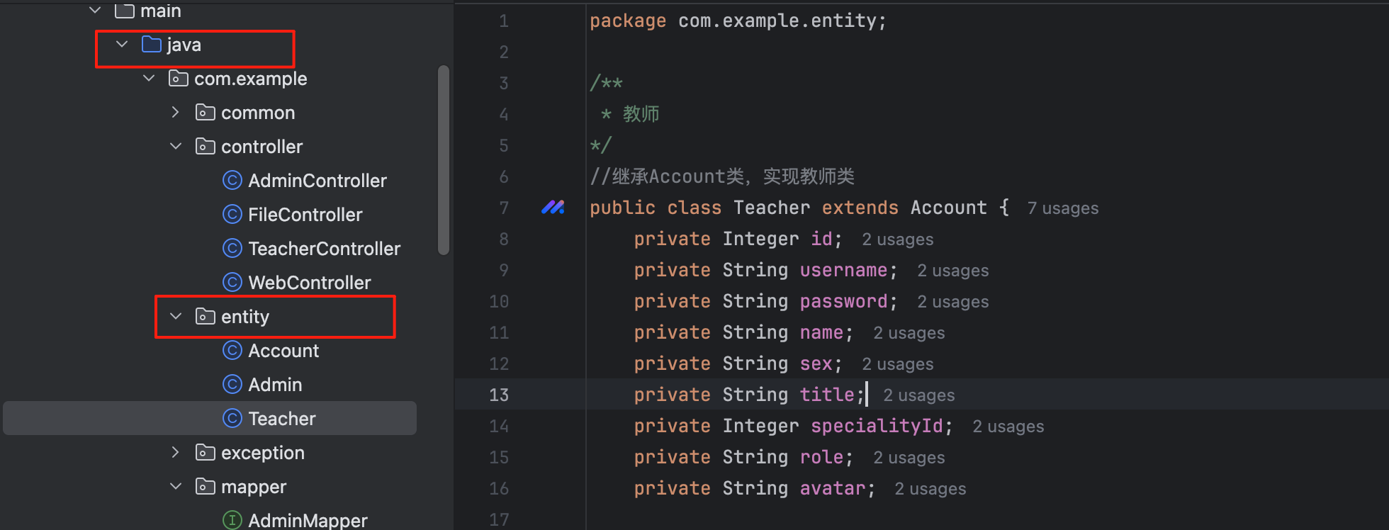 | public class Teacher extends Account { private Integer id; private String username; private String password; private String name; private String sex; private String title; private Integer specialityId; private String specialityName; private String role; private String avatar;